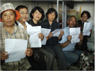 今年6月4日下午6时,我与俞晓妹、张秀琴二人在北京永定门长途汽车站前被20多名江苏南通截访人员围堵。俞晓妹当时紧急向北京110求助,北京警察到现场后,了解到我们是访民和当地截访之间的矛盾,北京警察明确的对我们说:你们这种事情我们不管。在众访民的帮助下,我们就近找了三把菜刀,牢牢握在手中。舍命与截访人员对峙了两个多小时。虽然我们暂时获得了自由,但是事后我们非常惊恐。每天外出都要结伴同时还要带上菜刀预防意外,连夜间去厕所也要带上菜刀……