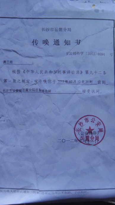 2012年7月12日中午,岳麓派出所所长谢良安上午向周三桂下达了传唤通知书。15点左右就去了长沙市公安局岳麓区分局岳麓派出所,18点才回到家。谢所长说,时间很急,要我们和拆迁指挥部协商,协商成了就算了,在7月12日晚上两点之前没搞好那我就把谢燕(周三桂的外孙女)“送监”了。并称下一个就是你,同样按“伪造公文罪”执行。