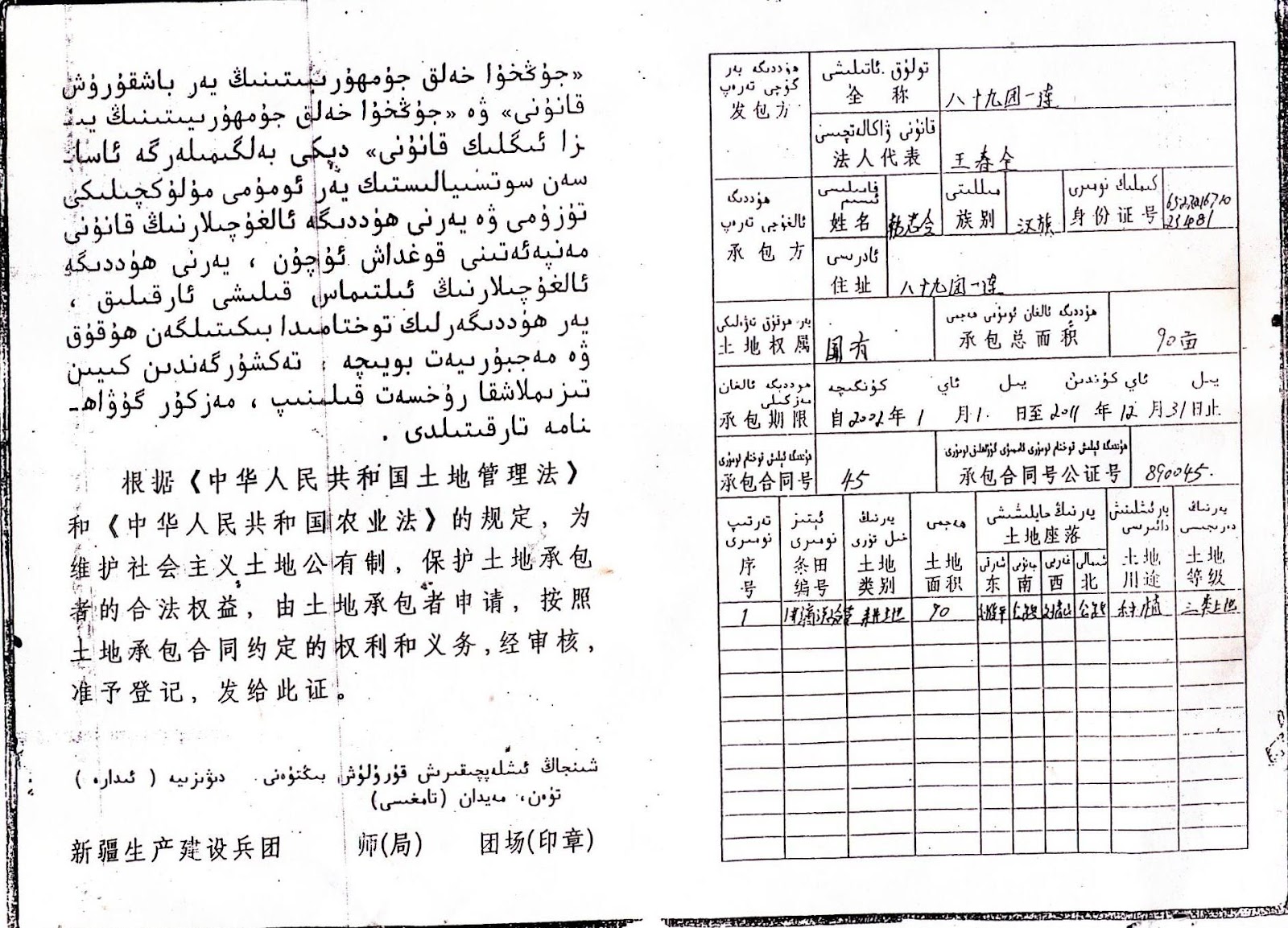 据了解,2002年棉花价格跌落低谷,土地承包不出去,团长和连队就强迫河南支边的双职工必须种90亩地以上,否则就开除职工队伍。无奈,薛桂平、韩忠合夫妻俩就承包了90亩土地,并且由兵、师、团颁发的“土地承包经营使用证”,经农五师公证处公正,合同是2002年~2011年。