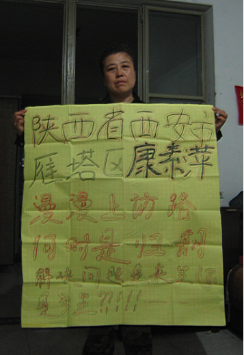 明天,也就是2012年9月27日,是康素萍就无辜被剥夺劳动权利整整两年的日子。在这两年中,康素萍没有任何经济来源,只有上访维权的痛苦经历!这两年来,所有官方的法定救济渠道都没有关心过她是如何生活?反而要在十八大再次进行暴力截访。