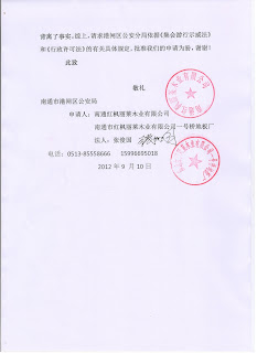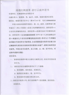 日前,南通市港闸区公安局治安大队徐队长及张副队长找红枫丽莱木业有限公司法人代表张俊国谈申请游行示威的事,称:自《示威游行法》公布施行20多年来,不要说经过自己批准了,至今也没有听说过有哪一个公安机关敢给老百姓的申请审批。再说,你游行示威的路线经过两个区,即使要申请也得向南通市公安局治安支队申请和审批。