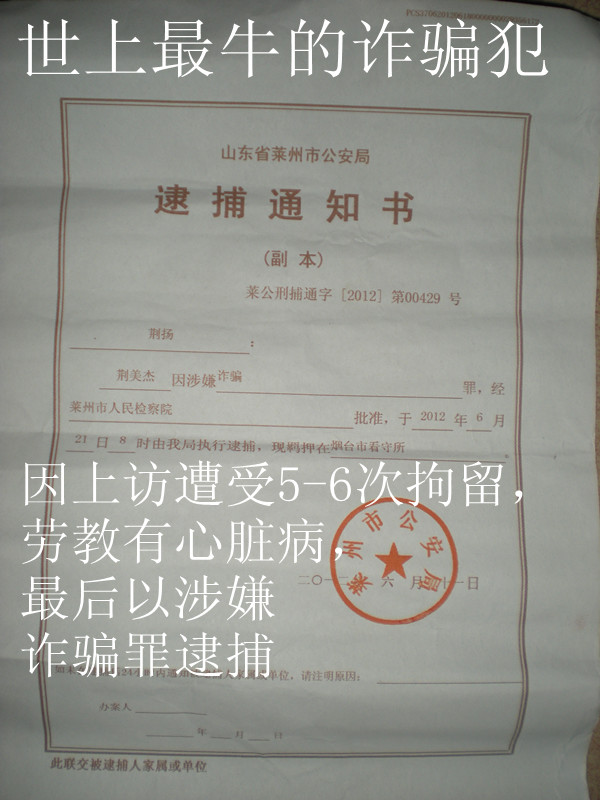 据了解,这一次游行示威的起因是莱州当局的公安长期以来对访民的残酷迫害,尤其是政府的“私法院”以无中生有的“诈骗”罪秘密逮捕访民荆美杰,导致其两个未成年孩子在失去父亲后又失去母亲的关爱和抚养,激发了访民们到北京天安门申请游行示威抗议的行动。
