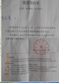 目前,马兰英在老太要求地方政府对自己依法维权13年所遭受的拘留、劳教等迫害给一个说法无果的情况下,于十八大前再次上访,并获得最高法院作出的11月2日接谈的预约。