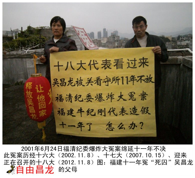 这几天正是代表们讨论总书记报告的日子,在代表们坚决拥护、激动飙泪的同时,福清纪委爆炸案蒙冤者吴昌龙的父母亲希望代表们看过来,关注一下这共和国第一人为悬案何时能依据诉讼法和诉讼程序了结?尤其是这一次到北京参加十八大的福建省政代表、纪委爆炸案“成功告破”的总设计师、福建省公安厅长牛继刚,权术还要禁锢司法公正到何时?