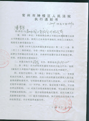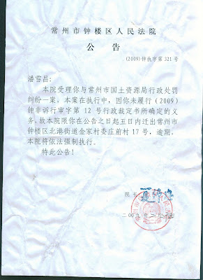 2月25日,常州市钟楼区北港街道金家坝村委庄前村抗暴英雄潘雪昌的妻子李双大晚上回到家中,看到大门口贴上一张钟楼区法院的执行公告,该公告依据常州市钟楼区法院枉法作出的(2009)钟非诉行审第12号行政裁定书,要求潘雪昌一家在5日内搬出居住的金家坝村委庄前村17号房屋。