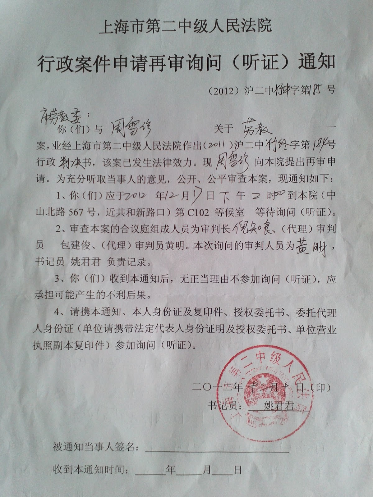 如果电话通知当作书面通知或者传票,那纳税人还用得着养这么多法官?当访友们听说法院竟如此把听证会当儿戏,大家于下午一起陪同周雪珍到第二中级法院讨说法。大家在法院大厅一直等待,并电话联系了审判员黄明和审判长倪知良,要求书面通知。