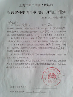 今天下午14:00点,是原冤民大同盟宣传部长、宝山区维权人士周雪珍劳教听证会在上海市第二中级人民法院第c102室举行的日期。上午10:00点左右,第二中级法院的姚君君打电话给周雪珍,称今天下午的听证会临时决定取消了,何时举行听通知。