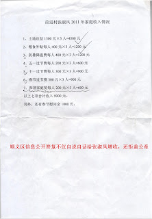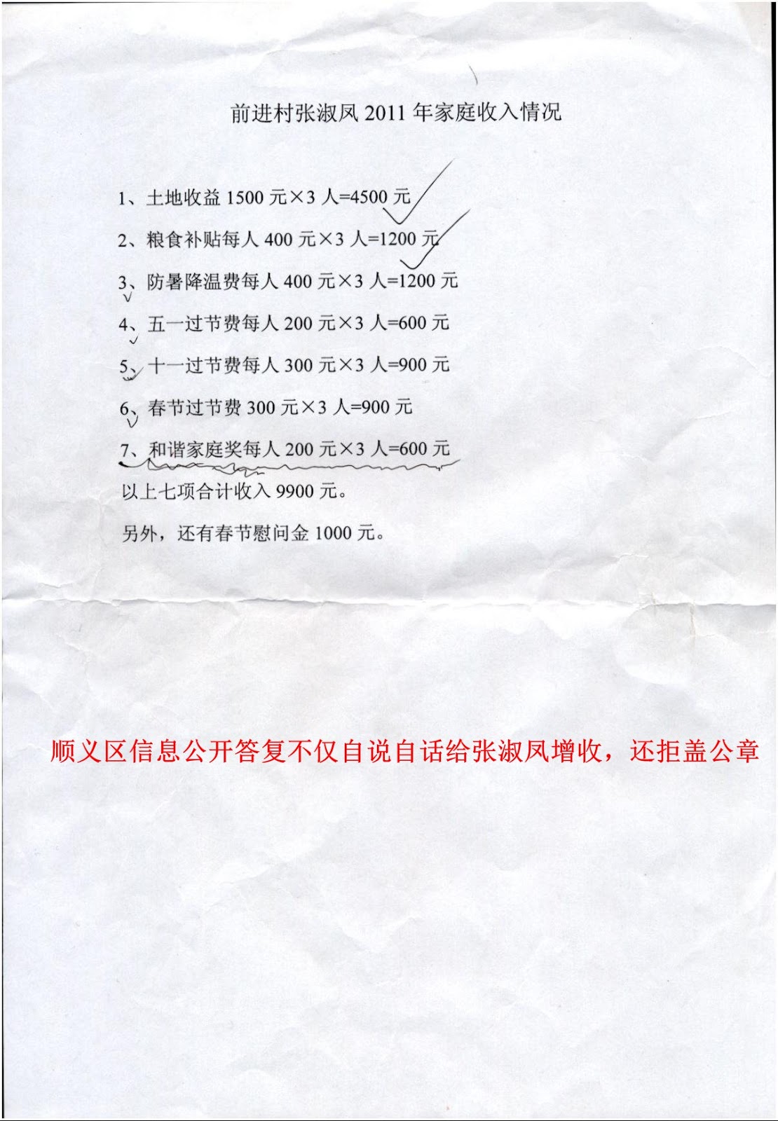 当张淑凤于2012年12月11日兴冲冲赶到顺义区民政局后,安建军副局长给予了一张书面答复,上面说明张淑凤家的收入情况,以证明不存在克扣,只不过是根据张淑凤家庭收入进行调整。