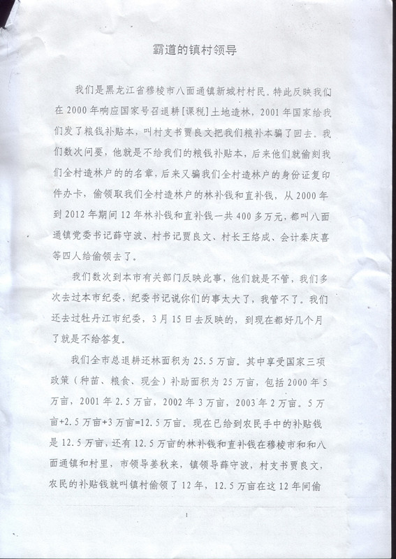 【提示:退耕还林,利国利民。如果当年毛泽东搞战略性大生产、大开荒的无知行为被制止,中国的西北部地区环境就绝不会是今天这样严重的水土流失状况,也许北京每年的沙尘暴和今年的雾霾就不会发生。由此,朱镕基离任前实施的退耕还林政策应该是明智和符合科学发展规律的。但,退耕还林的好政策最终又是肥了谁呢?黑龙江省穆棱市八面通镇新城村二组村民孔繁胜等,上访举报镇、村干部私刻村民印章,十多年持续盗领农民粮补、直补款的事实应该是非常清楚的,可结果却是问题不仅得不到重视,反而遭打击报复和非法拘禁。目前,村民代表们已向新一届中纪委举报反映,举报事项会有转机和得到重视吗?】