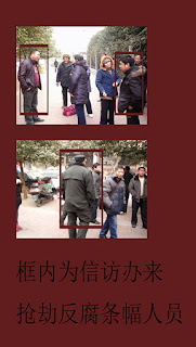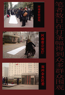 由于笔者走访、信访、网络信访逾万次无果。2013年1月7日,笔者在河南省信访局信访接待处门口打条幅。2013年1月8日至11日,笔者在河南省公安厅门口打条幅。2013年1月14日,笔者在郑州市金水区法院、金水区委达条幅。该反腐条幅得到大批群众围观也遭到来自东风路办事处的“抢劫”(未遂),同时公安厅领导、河南省信访局领导、金水区领导信誓旦旦承诺解决笔者诉求。