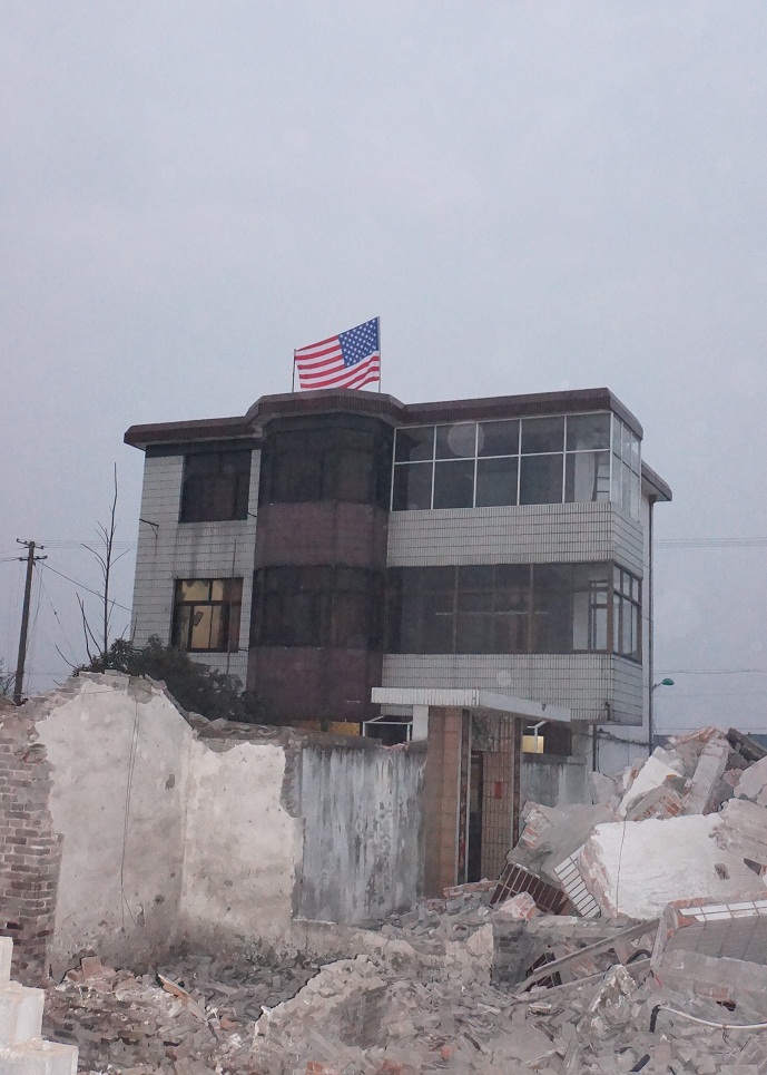 在胡锦涛的故乡江苏省泰州市高港区野徐镇上,一户姓毛的村民在自家楼房顶层挂起了一面巨大的美国国旗,抗议政府和开发商的非法逼迁。房主毛先生称,为了建设“泰州中国医药城”,政府和开发商自2009年起对当地多个村庄展开大规模的征地拆迁,而包括他所在村庄在内的多个地块拆迁实际上一直没有获得合法的征地批文。在多次诉讼以及信访无果后,他选择了这一方式表达对当地政府和司法的绝望。