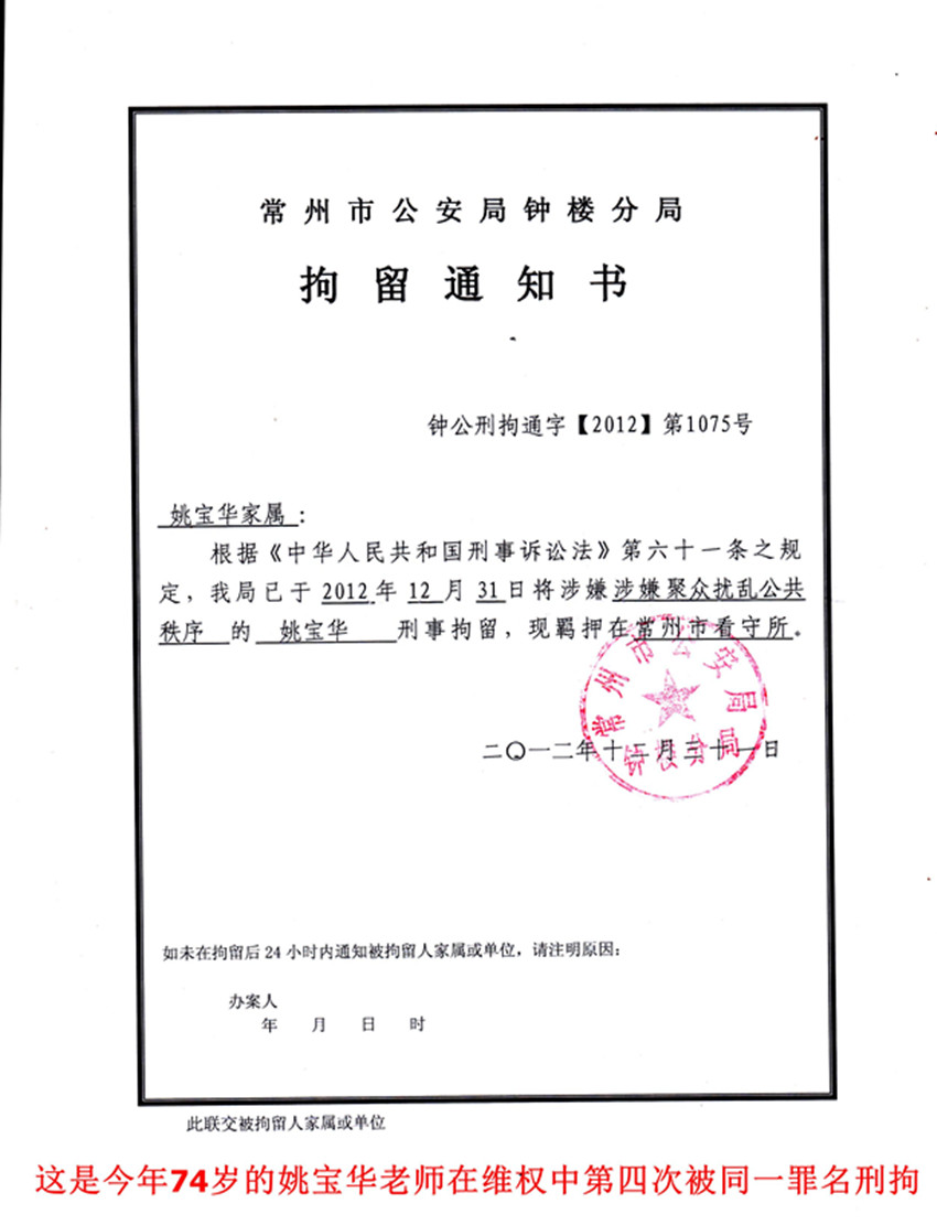 最近,江苏省常州市钟楼区把一个叫作姚宝华的74岁老人刑事拘留,据说是干了什么聚众的事情还寻衅滋事了,罪行很严重呀!