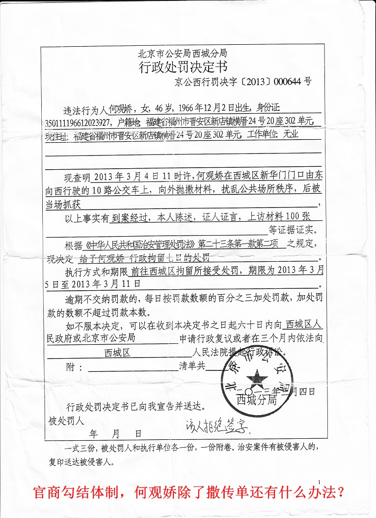 今天上午,已经第三次在马家楼黑监狱关押11天的何观娇终于获得自由。何观娇说:自己根本不能在祖国生存下去,因为这里贪官污吏太没有人性了。出了马家楼,何观娇就直奔美国大使馆,不顾一切把自己的冤情材料抛撒。