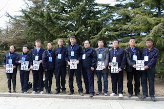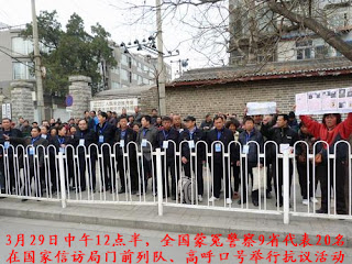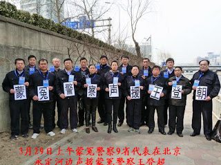 昨天(3月29日)中午12点半,来自黑龙江、辽宁、吉林、河北、河南、山东、江苏、湖北和贵州等九省约20名蒙冤警察来到国家信访局旁的永定河边,人人佩戴“全国蒙冤警察”胸卡,打出“蒙冤警察反对腐败”、“蒙冤警察声援王登朝”等标语,进行抗议司法腐败活动。