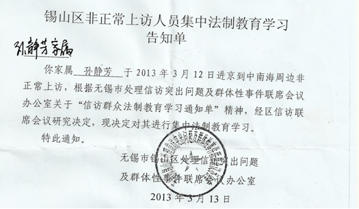 2013年2月12日,孙静芳正欲向国家信访部门陈述地方政府的恶劣行径,遭到无锡市驻京办警号220222警察,锡山区驻京办人员伙同东北塘街道工作人员张磊等人的截访,强行将她绑回无锡,3月12日18:00发出求助信号后,失去联络,下落不明。