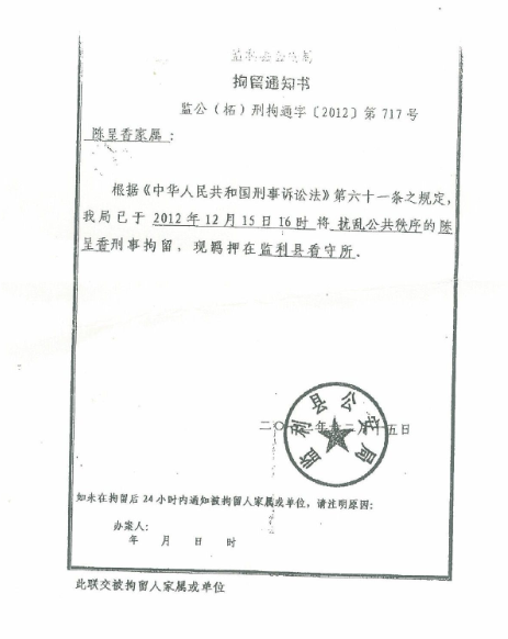 2012年12月13日,陈呈香因腰部遭黑保安伤害与一位河南籍的女人结伴去北大医院治病,途经府右街时,被警察以她是上访人员为由强行带到府右街派出所,胁迫她签训诫书,她反复申辩自己今天不上访,并且身上没带任何材料,无论怎样申辩都无济于事,最终还是被送到马家楼拘禁。最后,在湖北省驻京办人员的策划下,由地方公安机关强行押回湖北省监利县。同年12月15日县公安局以她“扰乱公共秩序”为由刑事拘留于监利县看守所。三天之后,柘木派出所付所长付红亮拿着盖有监利县公安局公章的临询劳教告知书胁迫她签字。