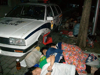 由于昨天下雨,大家都去对面的厨窗底下避雨,警察趁机把警车开上大家每天坚守的地方,用这种方式驱赶访民。