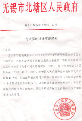 无锡市北塘区山北街道新华村居民向权利运动发来资料,北塘区政府近期又陆续向新华村居民发出非法的强制拆迁通知书,要滥用公权实施新一轮的违法拆迁,对新华村居民合法财产再一次进行疯狂掠夺。