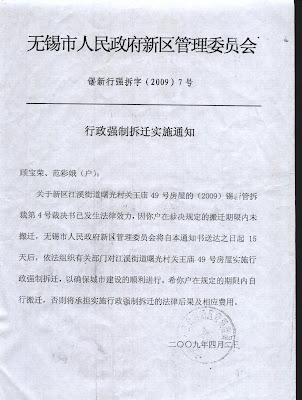 已经被征收为国有建设用地(村民还没有得到土地补偿金)的曙光地块居民理所当然拒绝当局的掠夺式拆迁,09年3月,无锡市重点工程建设办公室竟然以拆迁人的身份向没有拆迁行政裁决职能的无锡市新区拆迁办办公室申请强制拆迁,更为荒谬可笑的是,无锡市新区拆迁办公室竟然胡作非为,相继于09年3月和09年4月作出多份行政裁决支持无锡市重点工程建设办公室的非法拆迁申请。而曙光地块居民依据无锡市新区拆迁办公室作出的行政裁决书向依法人民法院提起告诉,而此时的人民“发”院却与当局密切配合,拒绝对曙光居民告诉的立案。