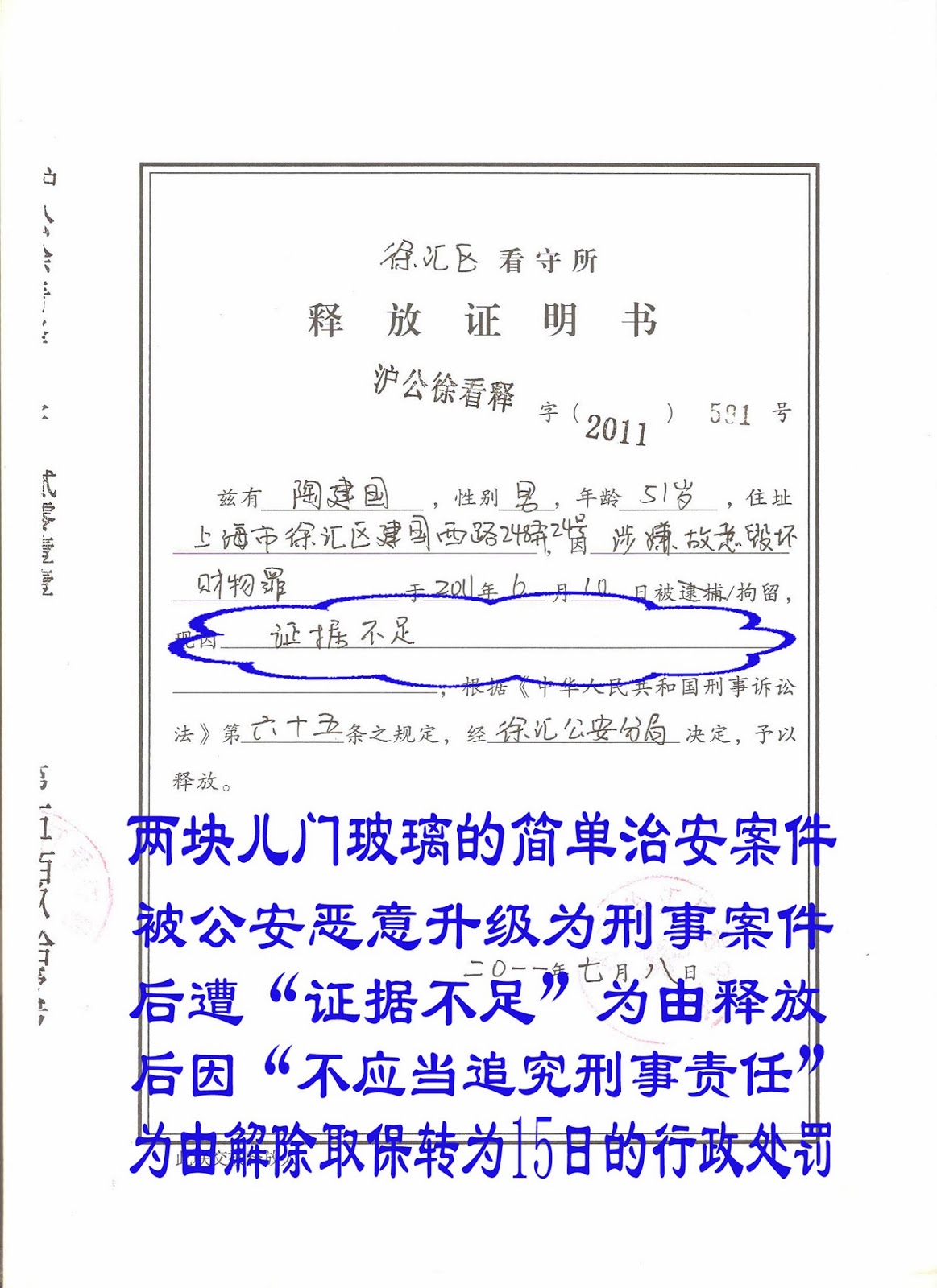 本人住宅由于开发商超越规划红线强行违法施工导致成为危房、20多处漏水、下水道和化粪池被恶意堵住,致使我全家无法正常生活。由于我在上海寻求各种途径解决诉求无果,被逼无奈我砸了开发商的两块儿门玻璃,本来一个很小的治安案件却被公安恶意升级为刑事案件来处理造成了我从上海到最高法的逐级诉讼。